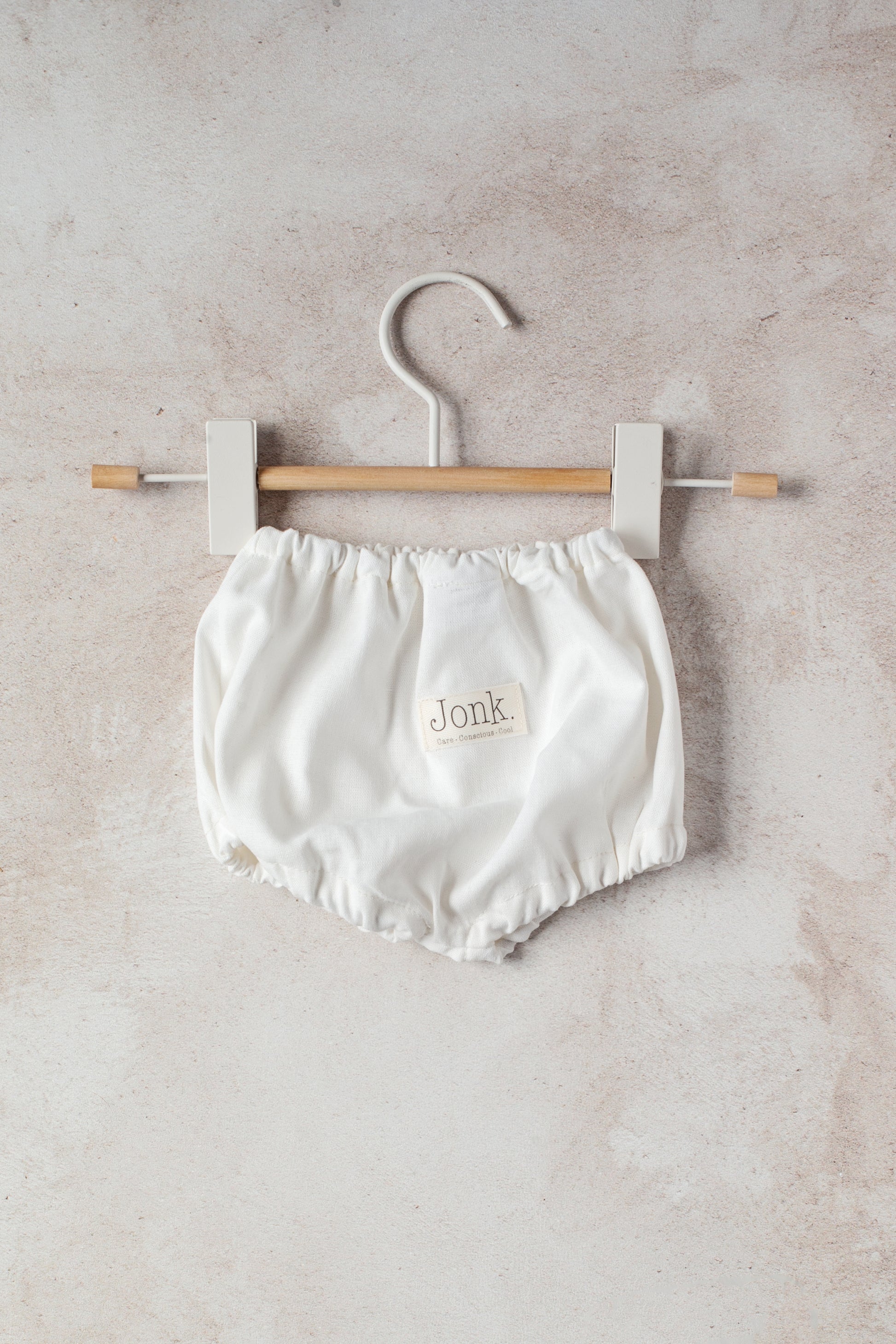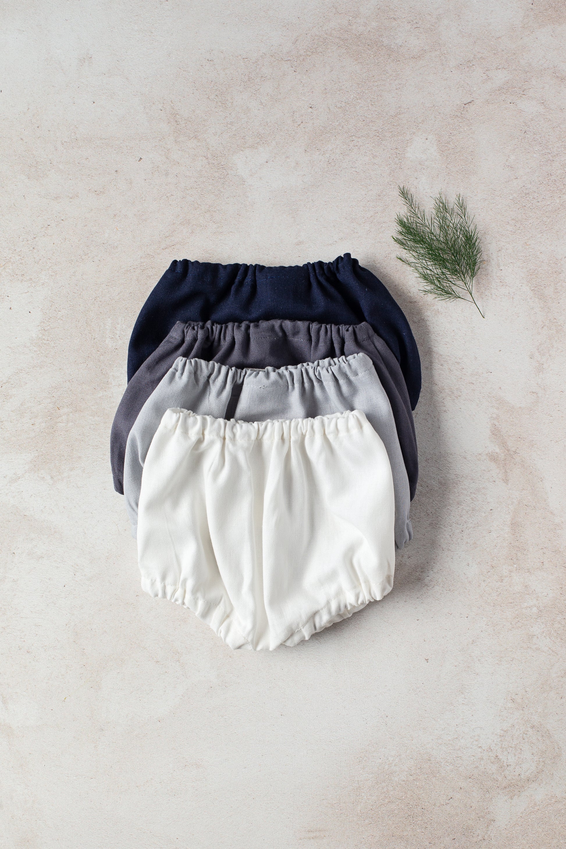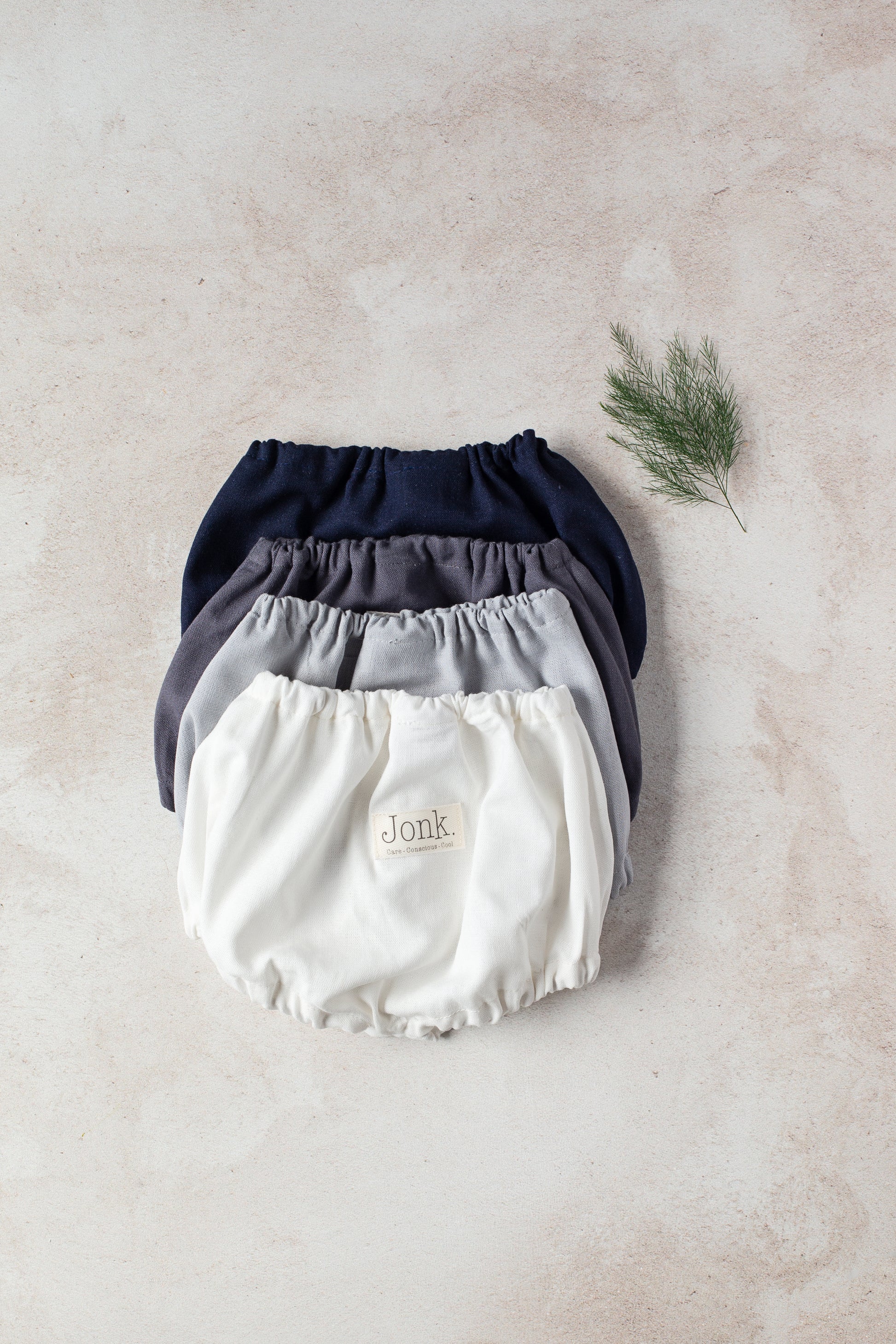 Soft linen nappy cover 'shorties' with a gentle elastic. Perfect for sunny days, sandy toes, and salty giggles.